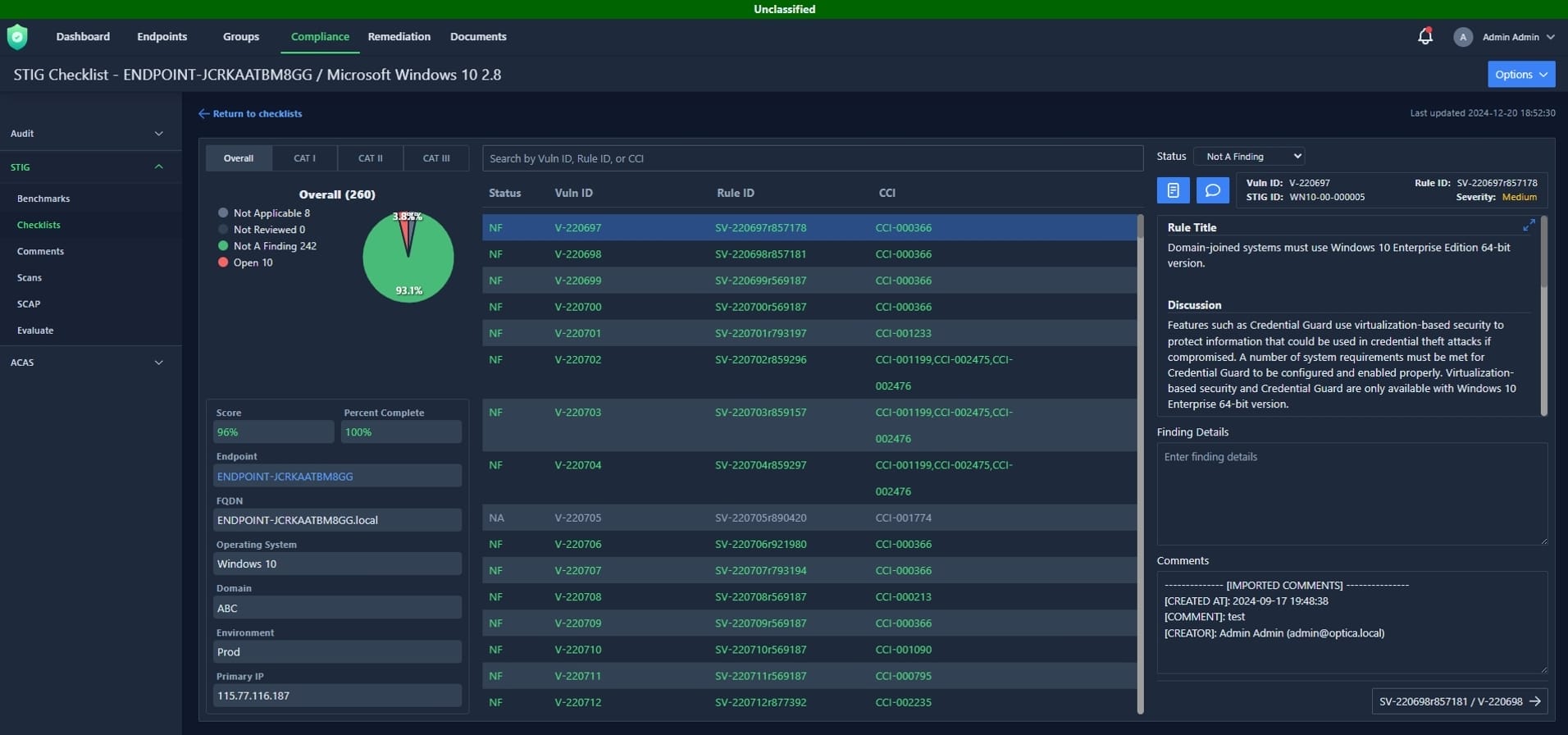 Developed with deep DoD expertise, OPTICA Security was born to tackle the challenges of manual compliance, siloed data, and limited visibility. Our platform centralizes STIG, SCAP, and ACAS data, automates compliance tasks, and delivers a bird’s eye view through an intuitive interface—slashing thousands of man-hours. OPTICA empowers cybersecurity, IT, and audit teams to focus on mission-critical priorities, ensuring security at scale.